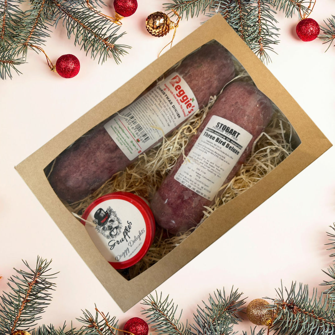 Contain: 1 x Reggies Christmas dinner 500g, 1 x Stobart Three Bird Deluxe 454g, 1 x Gruffles ice cream.