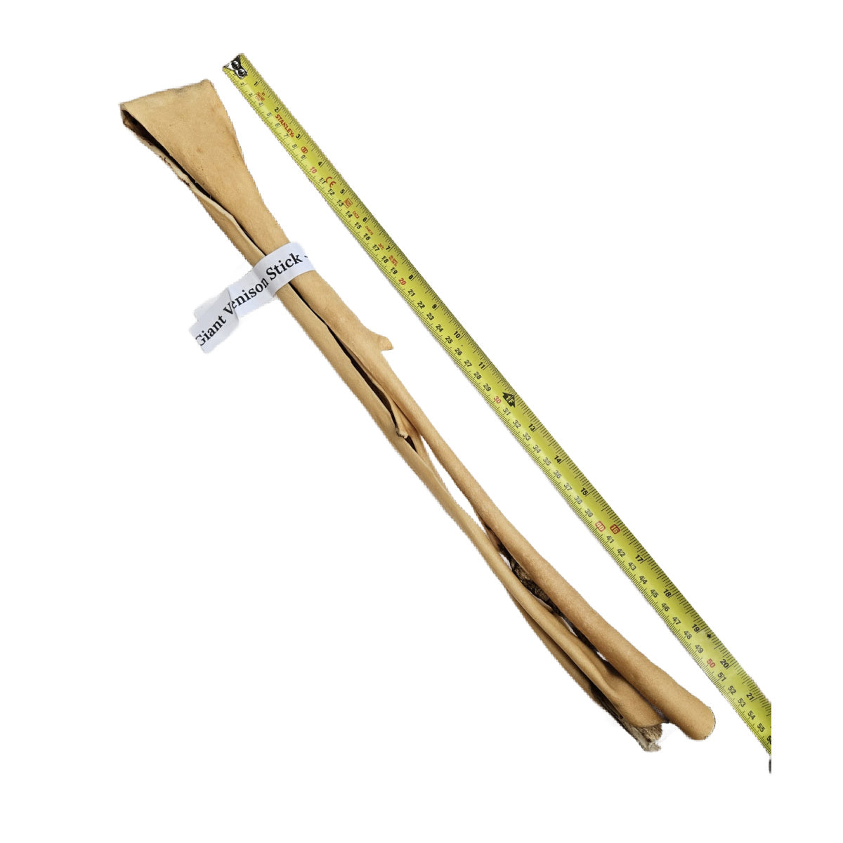 Loaded with a bundle of benefits. Venison skin is known as the most nutritious of all red meats, naturally lean & low in fat, a healthy source of protein, for helping aid in muscle & tissue repair. As well as Iron for supporting the transport of oxygen around the body & oxygen storage in muscle. Plus venison skin has excellent Omega 3 qualities which are beneficial for your dogs skin & coat while improving mobility by supporting stiff, aching joints. Omega-3 for dogs can control inflammation and help with wound healing, making it important for dogs with injuries. Large stick approx 40 - 50cm long. Long lasting chew.