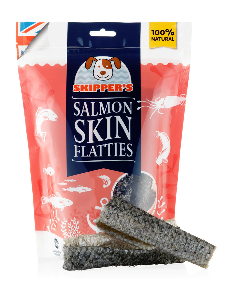 Our Salmon Skin Flatties come in two different sizes and ideal for dogs that like to hold treats in their paws and chew.